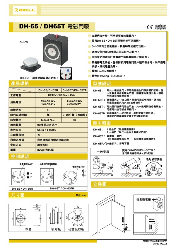 -DH-65TR:此機種具DH-65T功能,搭配可調式吸附板,適用於門扇與牆面夾角大於5度時使用。